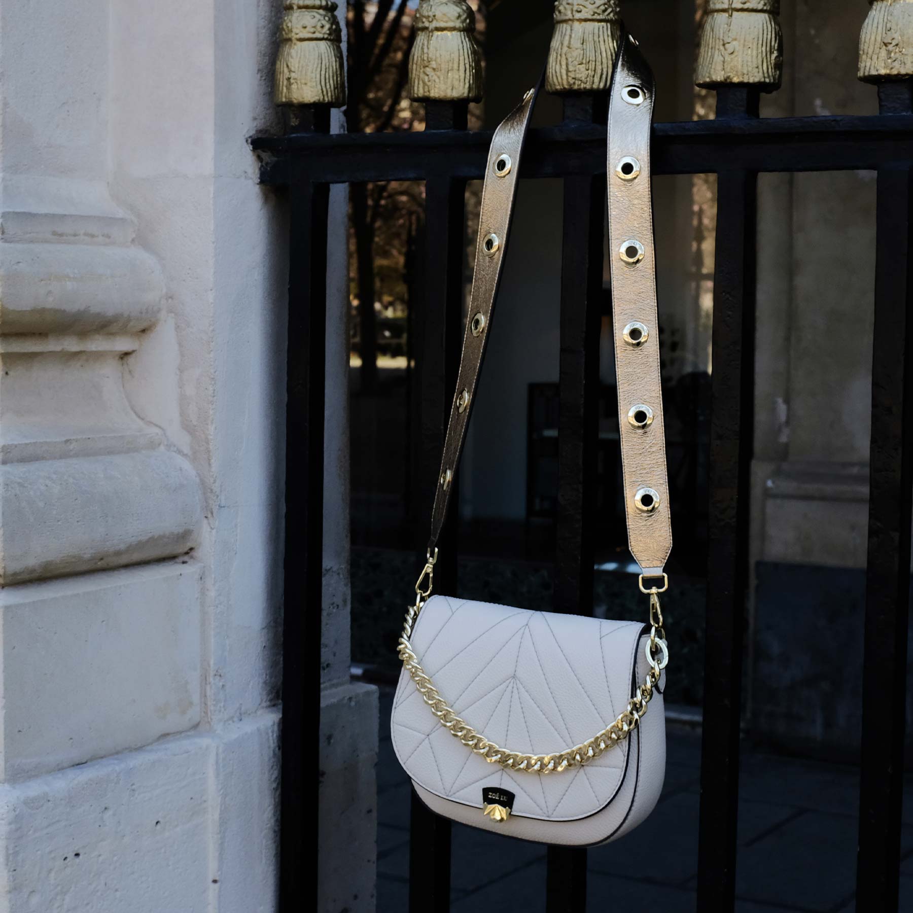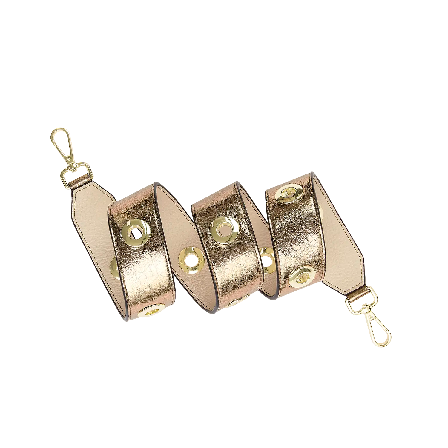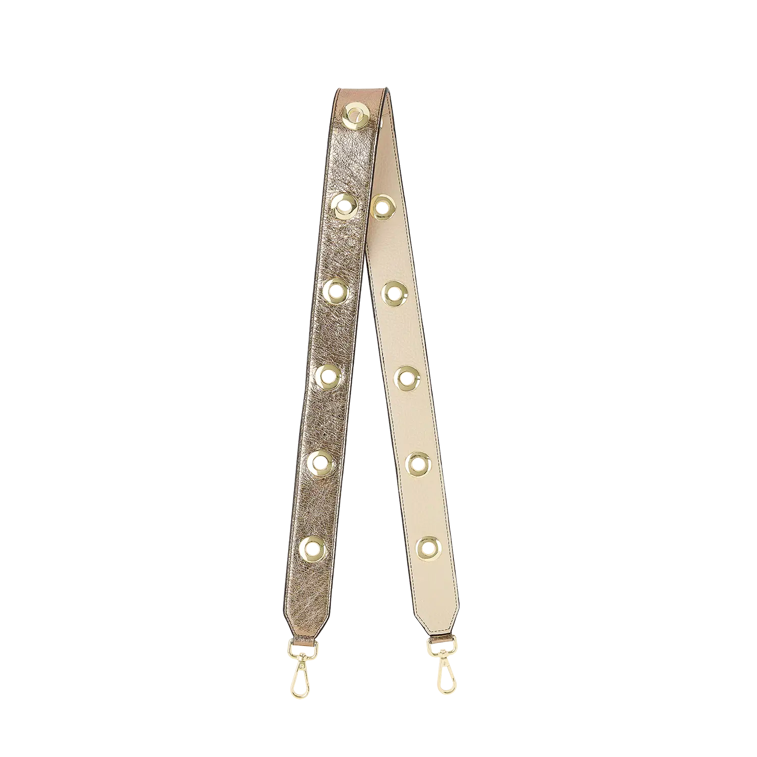 Austauschbarer Schulterriemen aus hochwertigem italienischem Leder und großen Metallösen, kompatibel mit allen Taschenkörpern.