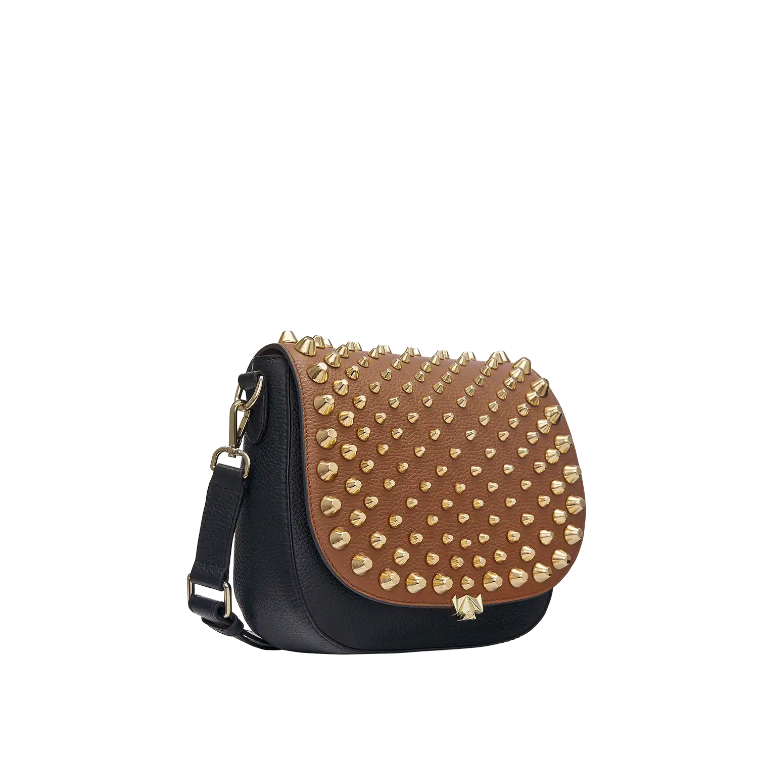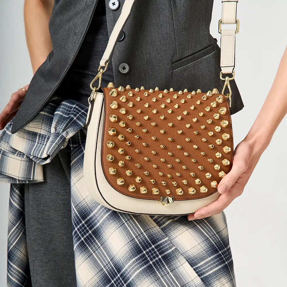• Handgefertigt, aus hochwertigem Premium Leder aus Italien. Die großen Statement Nieten sind ein absoluter Hingucker.  Das Leder bietet eine angenehm weiche Haptik und natürliche Optik. Im Zusammenspiel mit hochwertigster Qualität zeichnet es sich zudem durch seine Langlebigkeit aus und eignet sich perfekt für den täglichen Gebrauch.