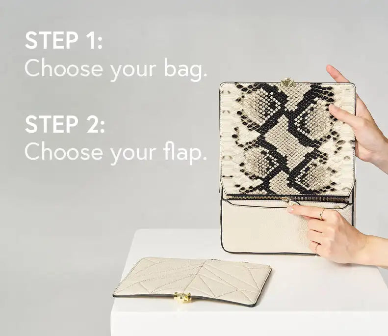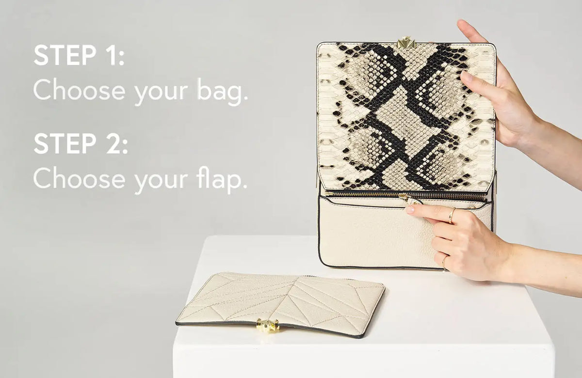 Wähle zuerst den Taschenkörper in deiner Wunschfarbe und danach die passende Eckige Wechselklappe.