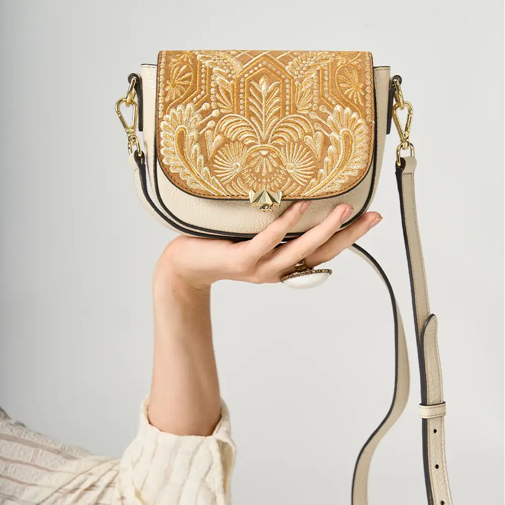 • Die Wechselklappe besteht aus hochwertigem Veloursleder aus Italien. Die aufwendigen Stickereien sind hanggefertigt und zeigen florale Elemente kombiniert mit geometrischen Elementen. Die Metallic Garne sind Made in Germany und Oeko-tex Standard 100 zertifiziert.