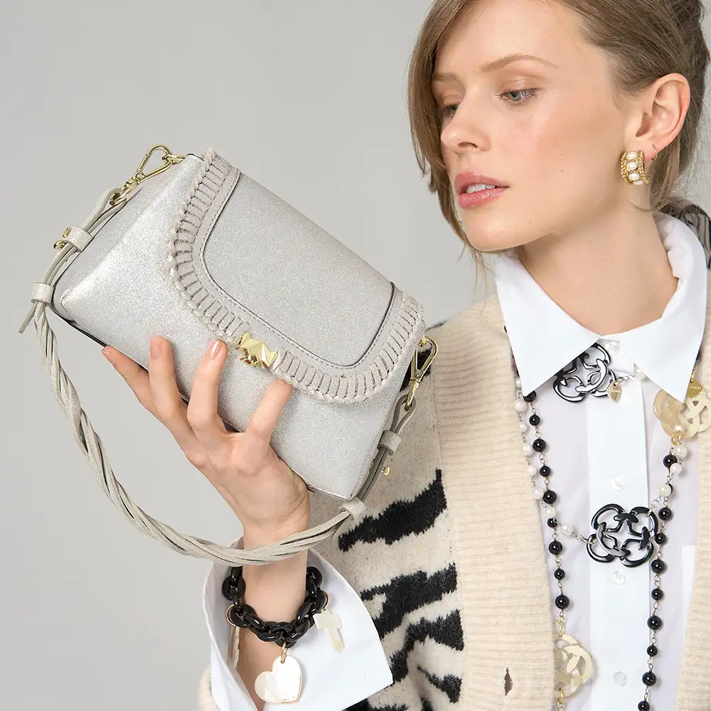 • Handgefertigt, aus hochwertigem Veloursleder aus Italien mit aufwendigen Flechtdetails. Die Wechselklappe hat einen sanftem Glitzereffekt, der im Sonnenlicht besonders schön zur Geltung kommt. Unser Premium Veloursleder zeichnet sich durch seine samtige Optik und Haptik und natürliche Optik aus.