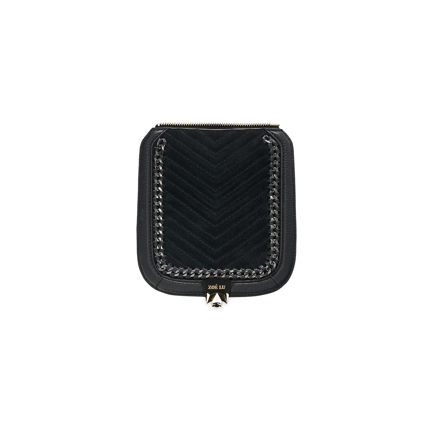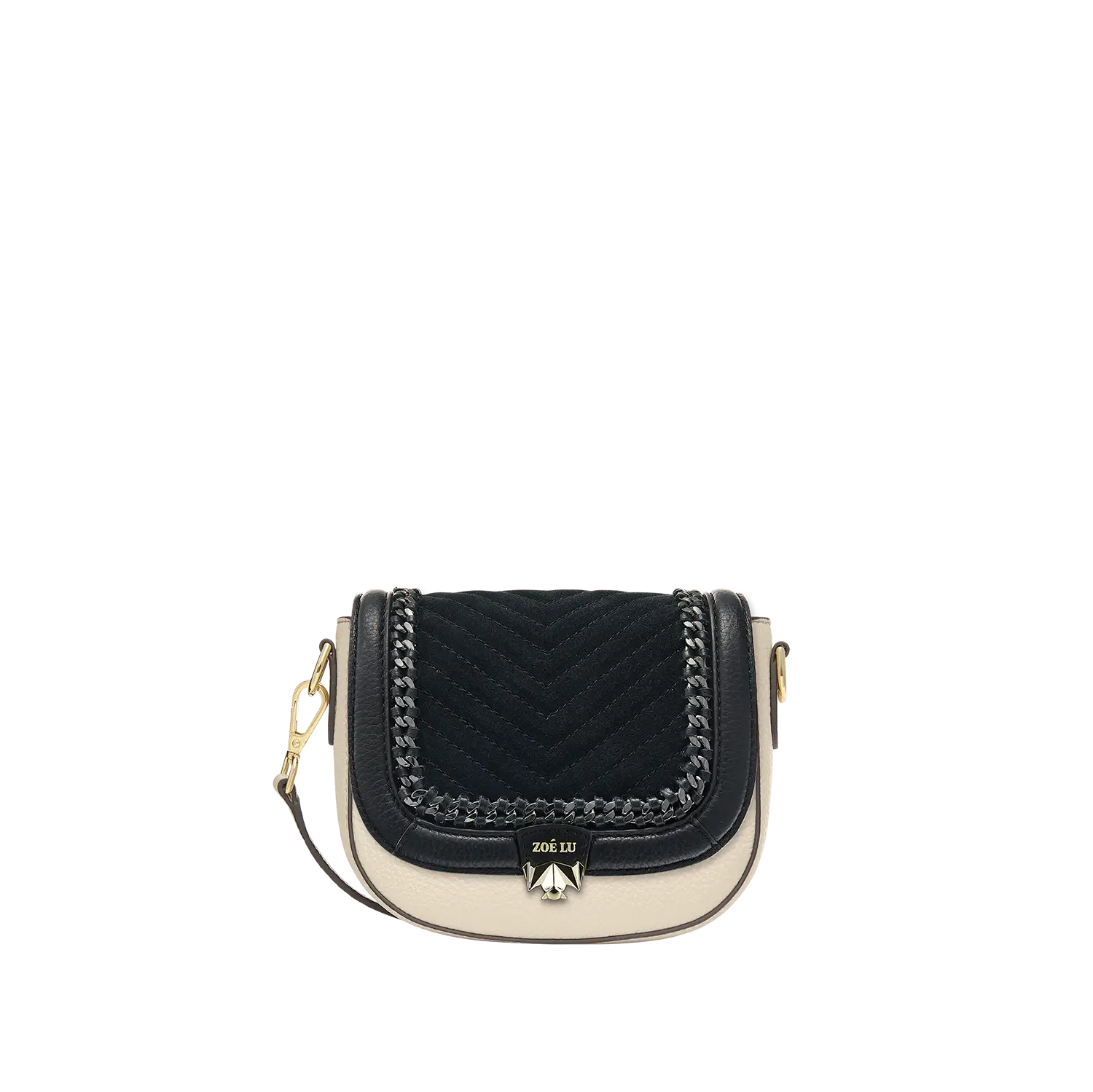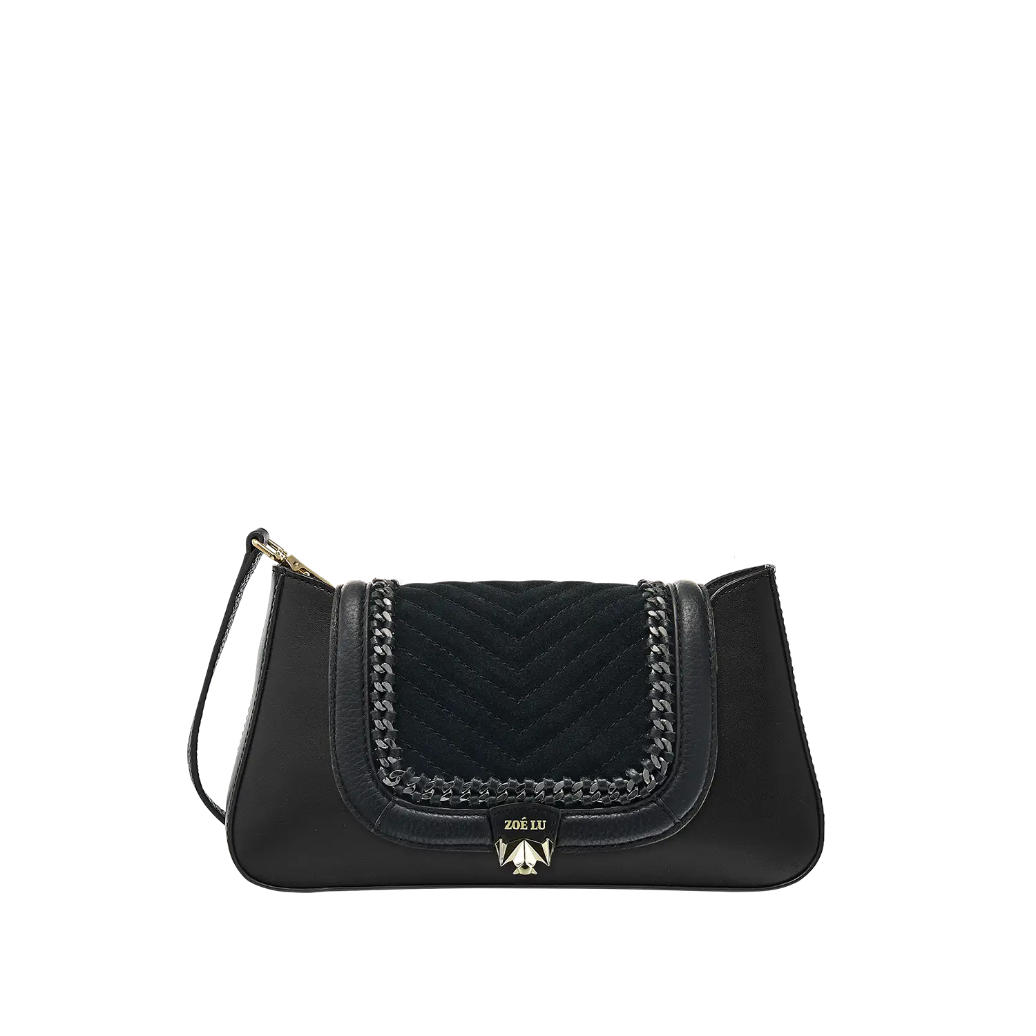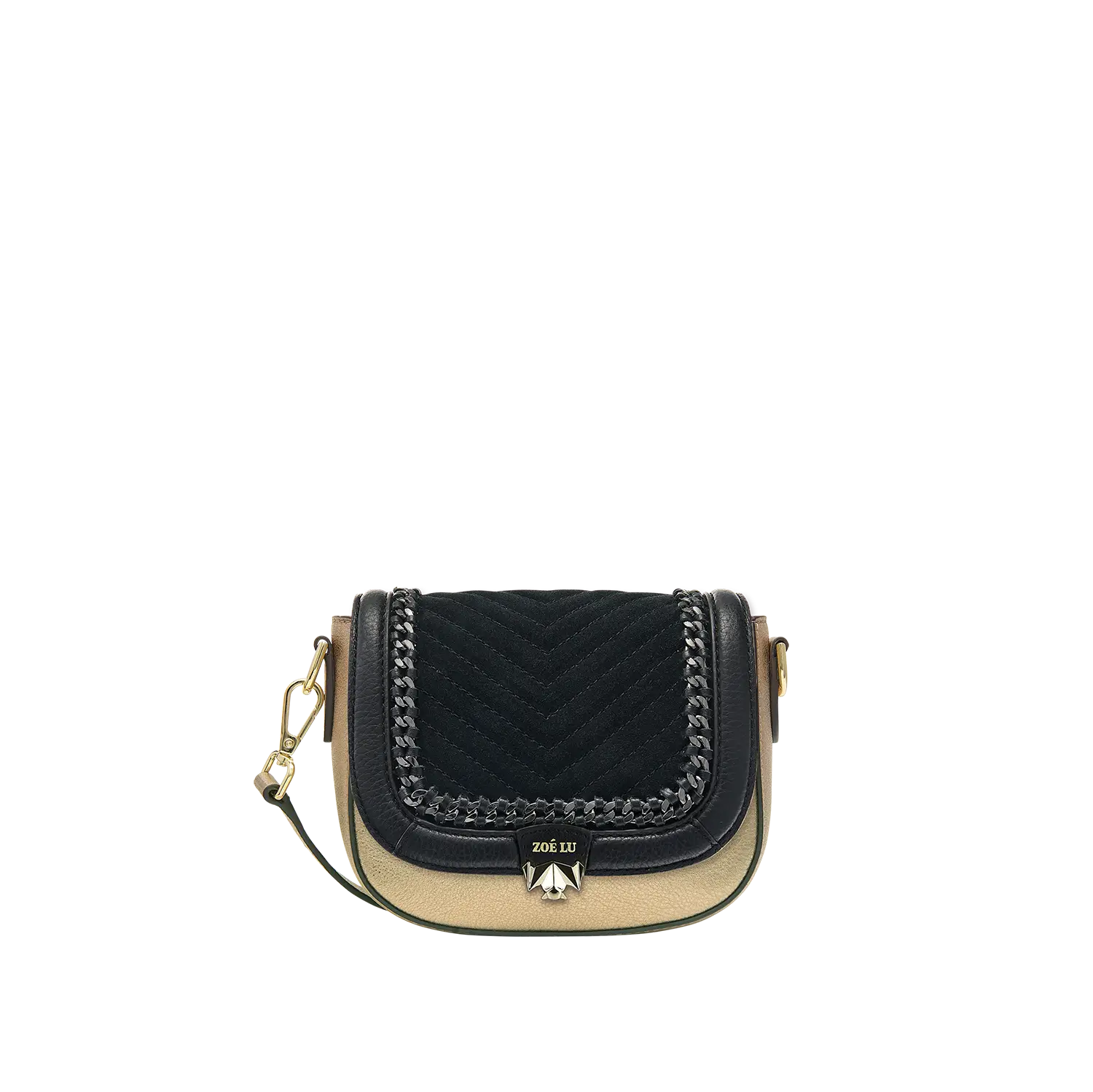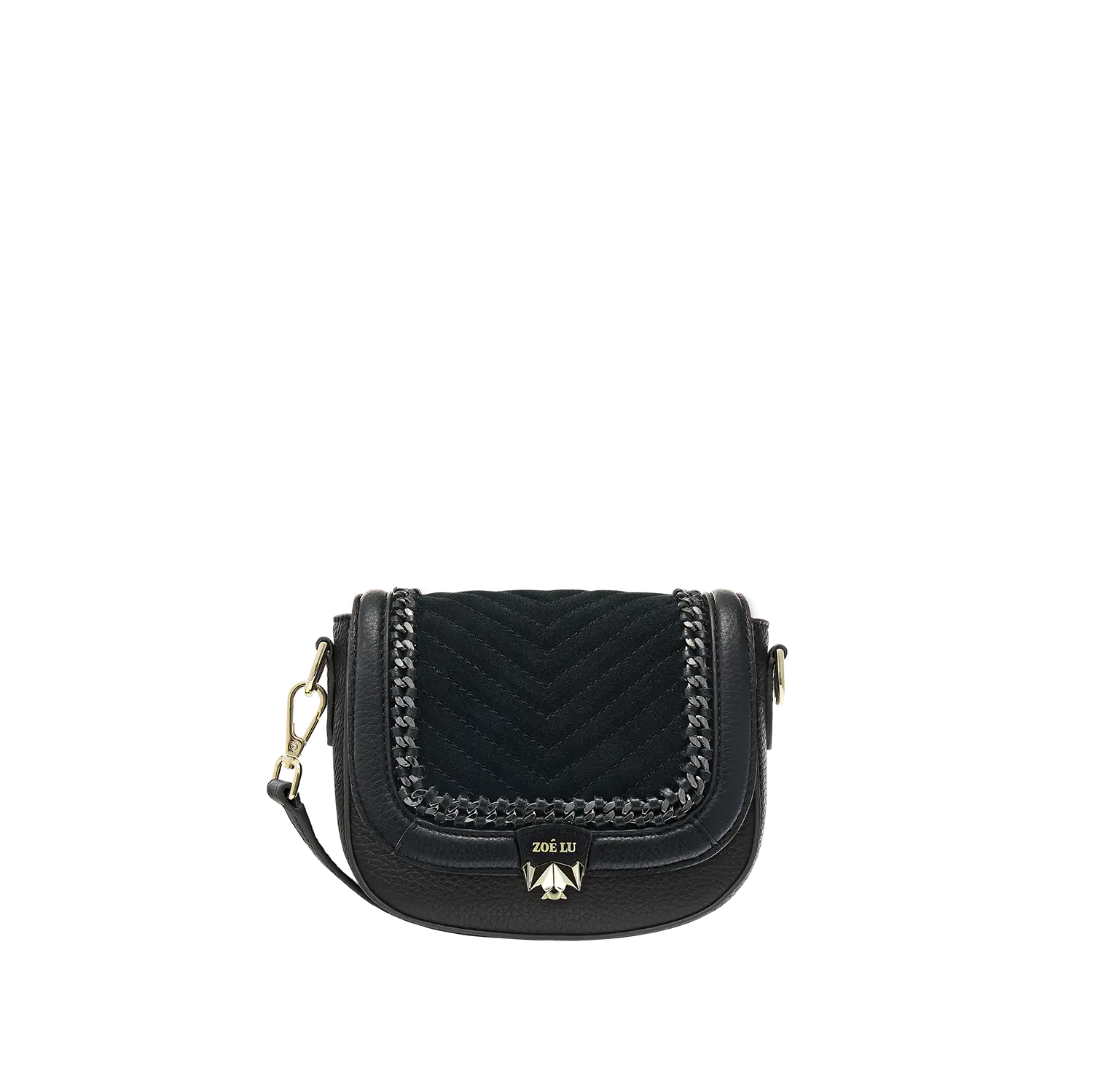 Die aufwändigen Kettendetails in der Wechselklappe Mini Minuit Noir entstehen in Handarbeit und machen diesen Style in Kombination mit Veloursleder im V-Stiching zu einem echten Statement-Piece. Die hellgoldene Metallkette wird in einem Rahmen aus Glattleder eingearbeitet.