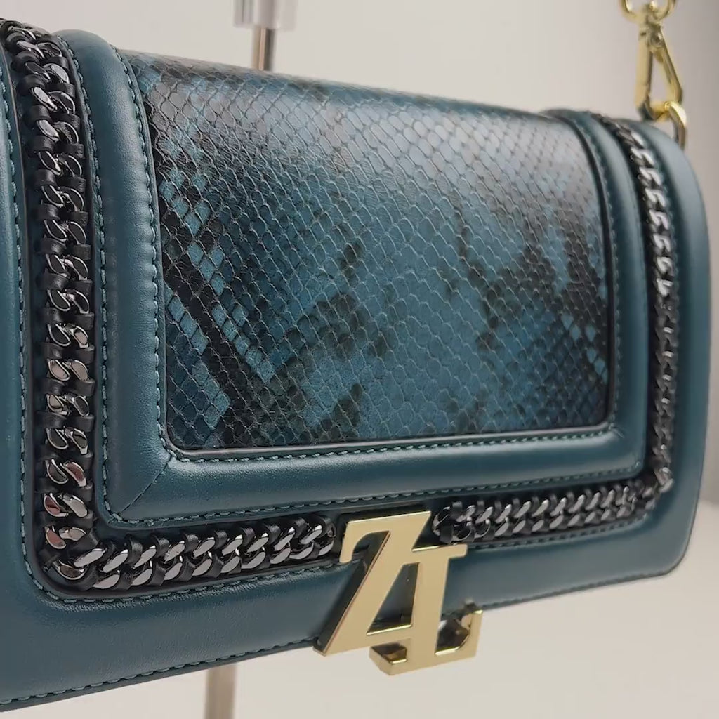 Die Wechselklappe In Between ist mit einer Kombination aus hochwertigem Glattleder in neon grün mit eingeflochtenen Kettendetails und geprägtem Leder in Schlangenoptik ein absolutes Statement Piece.